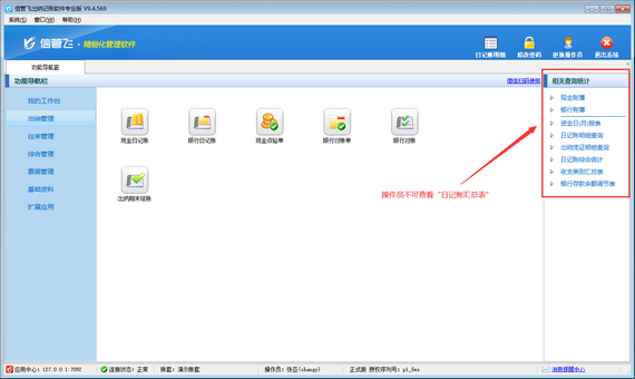 演示視頻觀看鏈接:出納記賬軟件如何設(shè)置操作員不可查看日記賬匯總表演示視頻 信管飛出納記賬軟件內(nèi)包含豐富的記賬統(tǒng)計(jì)報(bào)表,如現(xiàn)金賬簿、銀行賬簿、日記賬匯總表、收支類別匯總表等。如果不希望員工賬號(hào)登錄后查看到這些報(bào)表,如何設(shè)置呢?本篇文章演示一下出納記賬軟件內(nèi)如何設(shè)置操作員不可查看日記賬匯總表?