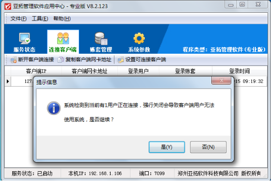 亞拓軟件采用新架構技術開發的進銷存管理軟件和庫存管理軟件:亞拓管理軟件(星光版、標準版、專業版)、亞拓倉庫管理軟件(標準版、專業版)都支持主機(插有加密鎖的機器即為主機)在應用中心中對可連接的客戶端進行管理,可以管理已連接到主機(插有加密鎖的機器即為主機)的客戶端電腦信息,包括客戶端IP、客戶端網卡地址、登錄操作員、登錄賬套以及登錄時間,讓系統管理員很方便的對