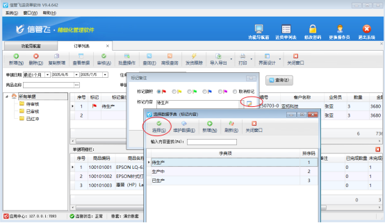 信管飛軟件支持對訂單列表、送貨單列表以及退貨單列表使用不同顏色旗幟標(biāo)記備注,把標(biāo)記常用內(nèi)容可提前維護(hù)到數(shù)據(jù)字典中,方便標(biāo)記時(shí)候直接選擇錄入,例如訂單列表,可以先把生產(chǎn)狀態(tài)維護(hù)在數(shù)據(jù)字典中,標(biāo)記直接使用。本文示范下如何操作? 訂單列表界面,雙擊標(biāo)記備注項(xiàng),點(diǎn)擊維護(hù)標(biāo)記備注內(nèi)容,進(jìn)入選擇數(shù)據(jù)字典(標(biāo)記內(nèi)容