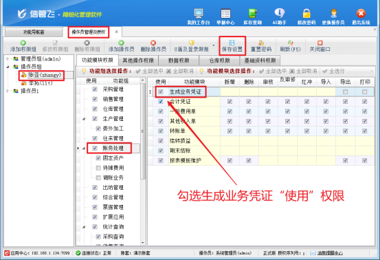 信管飛RMS專業(yè)版包含財(cái)務(wù)處理模塊,支持用戶高效、準(zhǔn)確地登記會(huì)計(jì)憑證,為企業(yè)的財(cái)務(wù)管理提供堅(jiān)實(shí)的數(shù)據(jù)基礎(chǔ)。在實(shí)際使用過程中,部分用戶反饋,當(dāng)使用操作賬號(hào)登錄軟件進(jìn)行賬務(wù)處理時(shí),界面中未顯示生成業(yè)務(wù)憑證模塊,而系統(tǒng)管理員賬號(hào)登錄后該模塊卻能正常顯示,這是因?yàn)椴僮鲉T沒有生成業(yè)務(wù)憑證權(quán)限導(dǎo)致的,本篇文章介紹下如何解決?