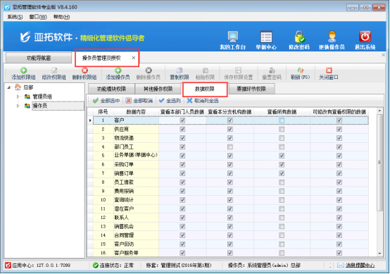 亞拓管理軟件、紅管家出納記賬軟件、紅管家倉庫管理軟件等都可以設置操作員的查看修改業務單據權限。通過設置操作員的“數據權限”,更清晰方便的管理分配的操作員單據權限。通過“系統管理”---》操作員及授權進入操作員管理及授權界面,在權限模塊可看到“數據權限”,在此設置操作員的“可修改有查看權限的數據”的權限,如圖1所示: 圖1 &nb