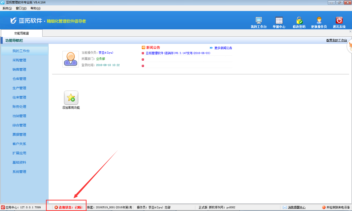 亞拓管理軟件、紅管家倉(cāng)庫(kù)管理軟件、紅管家出納記賬軟件、紅管家送貨單軟件、紅管家票據(jù)打印軟件中都支持建立多個(gè)操作員并對(duì)不同的操作員分配不同的權(quán)限,可以使用不同的操作員賬號(hào)登錄軟件,另外支持設(shè)置同一操作員只能登錄一個(gè)客戶端,本篇文章以亞拓管理軟件專業(yè)版為例詳細(xì)介紹下進(jìn)銷存管理軟件內(nèi)如何設(shè)置同一操作員只能登錄一個(gè)客戶端? 在亞拓