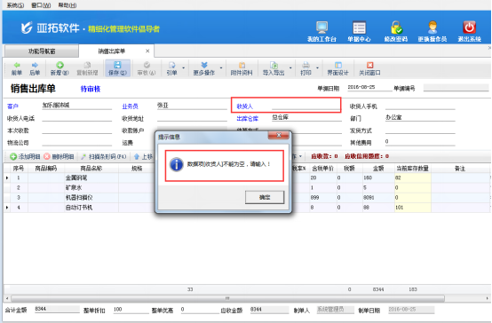 為了避免在開單的時候漏掉必須要填寫的信息,亞拓管理軟件、紅管家倉庫管理軟件、紅管家送貨單軟件等支持設計單據主體必填項。下邊以亞拓管理軟件專業版“銷售出庫單”開單為例,設置單據主體必填項。 新增一個銷售出庫單,軟件中已經設置好“客戶、業務員、出庫倉庫”為必填項(必填項設置為藍色顯示),如果要再增加“收貨人”為必填項,就需要進行