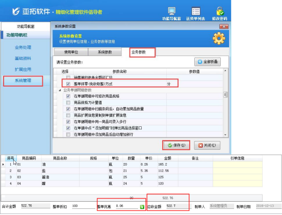 在銷(xiāo)售和采購(gòu)的過(guò)程中,會(huì)出現(xiàn)價(jià)格優(yōu)惠的情況,亞拓軟件的紅管家送貨單軟件和亞拓管理軟件支持兩種優(yōu)惠方式:打折優(yōu)惠、抹零取整。以抹零取整優(yōu)惠為示范,來(lái)展示下在軟件中如何設(shè)置抹零取整的默認(rèn)抹零單位,抹零取整有三種方式:元、角、分,軟件默認(rèn)選擇的價(jià)格參數(shù)是取整到“角”,我們以紅管家送貨單軟件為例,示范如何修改抹零取整的默認(rèn)抹零單位。