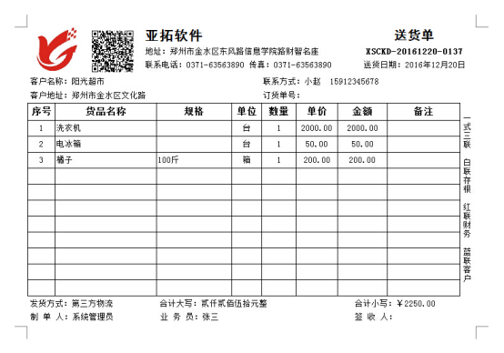 紅管家送貨單打印軟件是一款針對(duì)中小型企業(yè)開(kāi)發(fā)的集送貨管理(發(fā)貨管理)、退貨管理(銷(xiāo)售退貨)、銷(xiāo)售收款(應(yīng)收款管理)等功能為一體的送貨管理及打印軟件。 紅管家送貨單軟件內(nèi)置有模板設(shè)計(jì)器,軟件中提供數(shù)十種送貨單格式(發(fā)貨單格式),為了滿足更多客戶的需求,除了可以打印單據(jù)基本數(shù)據(jù)外,模板設(shè)計(jì)器增加了“二維碼”組件,可以實(shí)現(xiàn)“二維碼