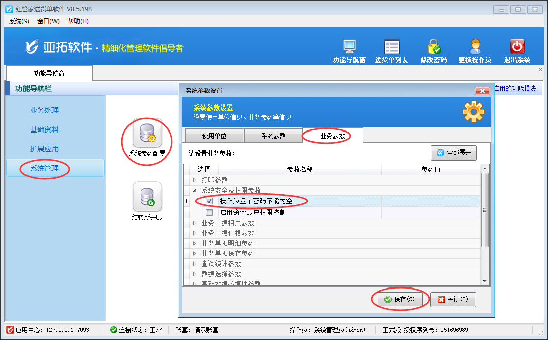 亞拓管理軟件、紅管家送貨單軟件、紅管家倉庫管理軟件、紅管家出納記賬軟件等軟件內(nèi)都可以設置多個操作員,并可以設置操作員登陸密碼不能為空,本篇文章我們以紅管家送貨單軟件為例詳細介紹一下如何設置操作員登陸密碼不能為空? 在功能導航窗點擊“系統(tǒng)管理”→“系統(tǒng)參數(shù)設置”→“業(yè)務參數(shù)”可以打開“業(yè)務參數(shù)”配置界面,在系統(tǒng)安全及權限參數(shù)內(nèi)