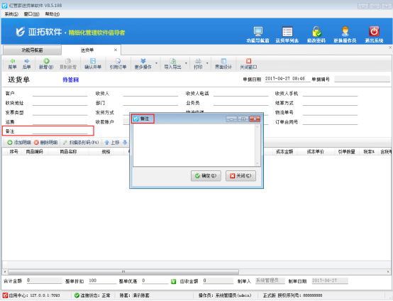 紅管家送貨單軟件、紅管家倉庫管理軟件和亞拓管理軟件單據(jù)中的擴展信息及備注等都可設置取值方式,都可以通過彈出窗口輸入的方式進行錄入信息。當錄入的備注或者擴展信息文本內(nèi)容比較多時,由于界面有限,直接錄入窗口無法顯示全部的錄入信息,我們可以設置該數(shù)據(jù)項的取值方式為“彈出窗口輸入”,方便錄入更多的數(shù)據(jù)內(nèi)容。 我們以送貨單軟件為例,示