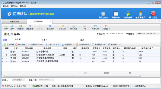 期初數(shù)據(jù)的所謂期初是指計劃使用軟件日期(即賬套啟用日期)前的業(yè)務(wù)數(shù)據(jù),在正式使用軟件之前,需要先錄入好期初數(shù)據(jù),期初數(shù)據(jù)包括期初商品庫存、期初應(yīng)收應(yīng)付款、期初科目余額等。本篇文章我們以亞拓管理軟件專業(yè)版為例來介紹一下如何錄入期初商品庫存? 在功能導(dǎo)航窗點擊“基礎(chǔ)資料”—》“期初建賬”—》“期初庫存錄入”,系統(tǒng)可以打開“期初庫