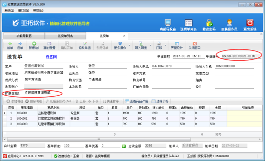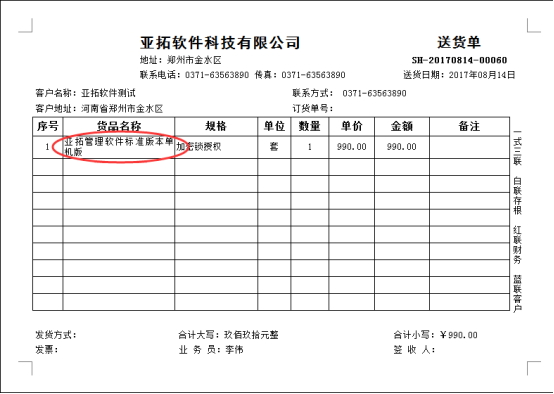亞拓管理軟件、紅管家送貨單、紅管家倉庫管理軟件等支持打印單據(jù)內(nèi)容,新增自定義打印模板,有時候存在商品名稱過長導(dǎo)致在模板的文本框中顯示不全,可以設(shè)置打印模板中的文本框為自動折行顯示。 以送貨單軟件為例,示范下如何設(shè)置打印模板中文本框為自動折行。先新增一個送貨單,商品名稱為“亞拓標準版本單機版”正常開單后