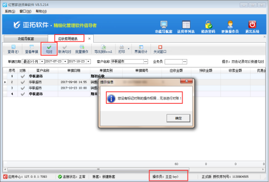 亞拓管理軟件、紅管家送貨單軟件支持管理應(yīng)收賬,對(duì)于已結(jié)銷的應(yīng)收款,可以在應(yīng)收款明細(xì)表中標(biāo)記對(duì)賬。軟件支持設(shè)置操作員是否具有對(duì)賬權(quán)限,以送貨單軟件為例,示范下如何控制操作員的應(yīng)收款對(duì)賬權(quán)限。 在功能導(dǎo)航窗,點(diǎn)擊“操作員管理及授權(quán)”,進(jìn)入操作員管理及授權(quán)頁面,選擇需要設(shè)置的操作員“王亞”(系統(tǒng)管理員默認(rèn)具