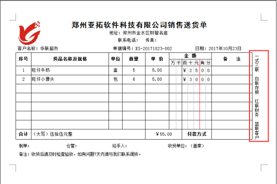 亞拓管理軟件、紅管家送貨單軟件、紅管家倉庫管理軟件都支持設(shè)置自定義打印模板,比如:三聯(lián)單打印模板,三聯(lián)單打印模板需要在右側(cè)顯示出每聯(lián)單的保存作用,以“一式三聯(lián) 白聯(lián)存根 紅聯(lián)財(cái)務(wù) 藍(lán)聯(lián)客戶”為例,示范下如何在三聯(lián)單打印模板中添加此字樣。 在紅管家送貨單軟件中,在功能導(dǎo)航窗選擇“業(yè)務(wù)處理”—》“新開送貨