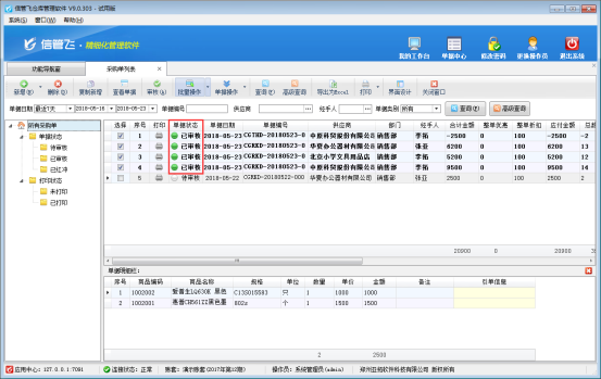 信管飛倉庫管理軟件、信管飛RMS軟件新增采購單都可以直接保存并審核單據,軟件還支持批量審核采購單。如果您每天錄單量較多,為了節省時間提高工作效率,可以使用批量審核功能,下邊我們在信管飛倉庫管理軟件的采購單列表中示范下如何使用批量審核功能。 在功能導航窗點“采購管理”—》“采購單列表”即可進入“采購單列