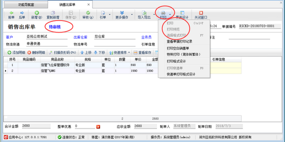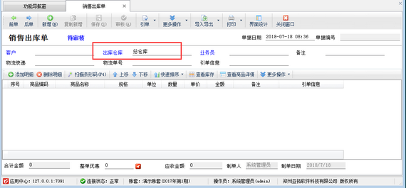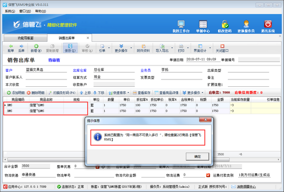 信管飛送貨單軟件、信管飛倉庫管理軟件、信管飛RMS等軟件在新開業務單據時默認在一個單據單據明細內支持同一商品可添加多條記錄(如下圖一所示),部分用戶在開單時需要設置在單據明細中同一商品不可錄入多行?該如何設置呢?本篇文章我們以信管飛RMS為例來介紹一下如何設置開單時單據明細中同一商品不可錄入多行。圖一 銷售出庫單界面 在功能