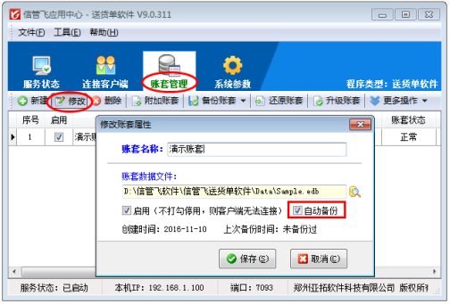 信管飛送貨單軟件、信管飛RMS、信管飛出納記賬軟件、信管飛倉庫管理軟件及信管飛票據軟件都支持設置賬套自動備份,我們強烈建議啟用自動備份功能,以便賬套出現問題的時候從賬套備份文件中恢復數據。下面我們以信管飛送貨單軟件為例詳細介紹一下如何啟用賬套自動備份功能? 首先打開軟件應用中心主界面,點擊“系統參數”—》“賬套備份參數”,可
