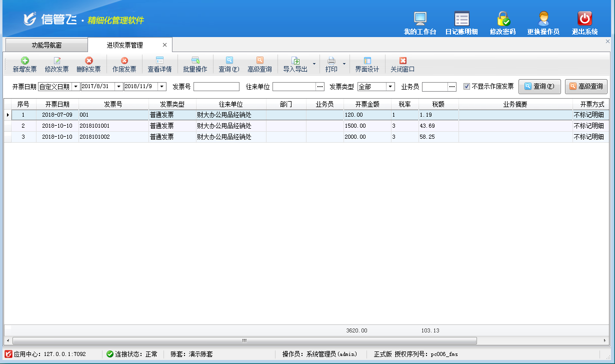 企業在開采購入庫單和銷售出庫單時都存在開發票的情況,信管飛RMS軟件發票管理功能可以讓企業高效快速地管理發票信息。發票管理功能支持對銷項發票的領購登記、使用(填開、作廢)等整個流程的管理,并能夠全面記錄銷項增值稅專用發票、銷項普通發票以及各種進項發票的開具信息。 發票管理為擴展模塊,只有信管飛RMS標