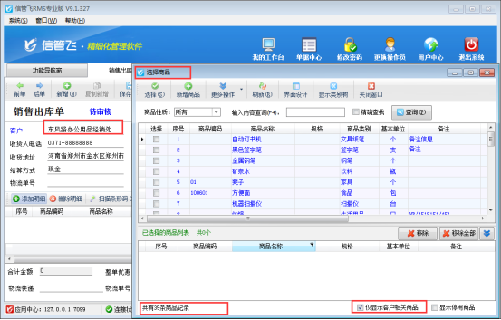 信管飛RMS軟件、信管飛倉庫管理軟件和信管飛送貨單軟件開單時都支持選擇系統(tǒng)內已錄入的商品信息,進行快速選擇商品來開單。選擇商品時在選擇商品窗口默認是可以顯示所有商品(圖1),但是部分用戶在選擇商品時只需要顯示此客戶相關的商品,如何設置呢?本篇文章我們以信管飛RMS 專業(yè)版軟件為例來詳細介紹一下如何設置在選擇商品窗口僅顯示客戶相關商品? 圖