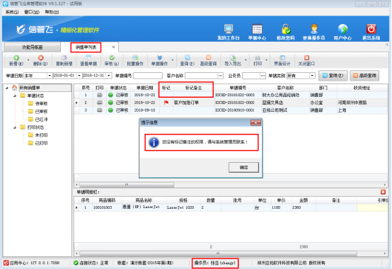 信管飛倉庫管理軟件可以對銷售單列表、采購單列表、銷售訂單列表、采購訂單列表進行標記備注。如果不允許操作員標記單據(jù)備注,可以對操作員取消“標記單據(jù)備注”的權限。下面我們介紹一下在信管飛倉庫管理軟件中設置操作員不可標記單據(jù)備注的操作步驟。 系統(tǒng)管理員登錄軟件后,在功能導航窗點“系統(tǒng)管理”—》“操作員及授權”即可進入“操作員管理及