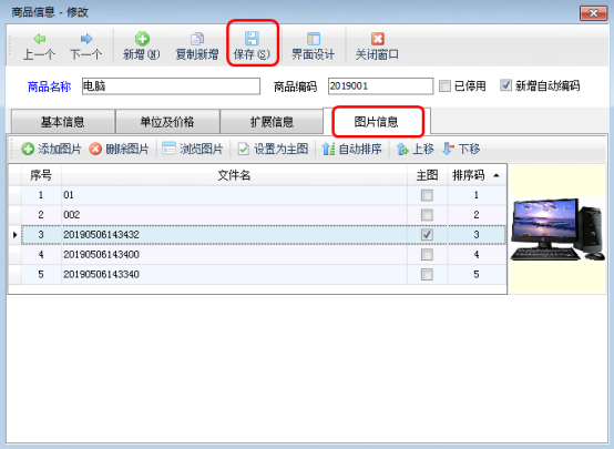信管飛倉庫管理軟件、信管飛RMS(進銷存軟件)都可以對商品信息進行管理,都支持上傳商品圖片,以便用戶查看商品圖片信息。本篇文章以信管飛倉庫管理軟件為例介紹一下如何上傳商品圖片。 在功能導航窗點“基礎資料”—》“商品信息”即可進入“商品信息”界面,對商品進行新增或修改時可以編輯商品信息、上傳商品圖片信息。以商品“電腦”為例,對