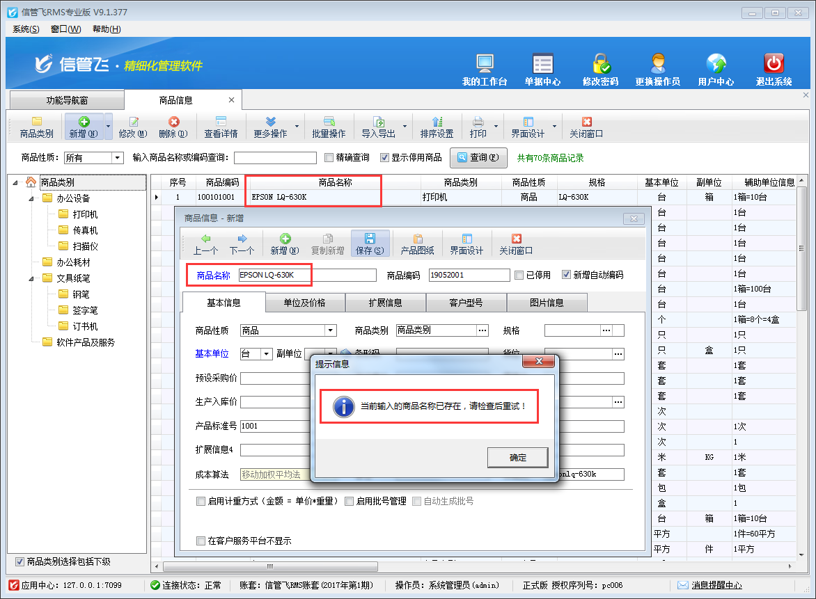 亞拓軟件自主研發的信管飛RMS、信管飛送貨單軟件、信管飛倉庫管理軟件等都支持新增商品信息,為了避免增加的商品信息出現重復,軟件支持參數設置商品名稱不可重復。 以信管飛RMS為例,在系統管理—》系統參數配置—》業務參數內將“數據可否重復參數”中的“商品名稱可重復”參數的勾選取消,然后保存設置。如下圖所示: