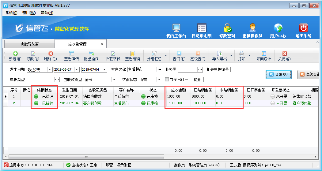 客戶預付款是客戶提前預付給我們的金額,可以用來沖銷銷售產(chǎn)生的應收款,本文以信管飛出納記賬軟件專業(yè)版為例演示一下如何使用客戶預付款沖銷銷售應收款? 在功能導航窗點擊“往來管理”—》“應收款管理”打開應收款管理界面,如下圖所示,在應收款管理內對同一個客戶分別新增一條應收款記錄,一條預付款記錄,結銷狀態(tài)為“未結銷”狀態(tài),