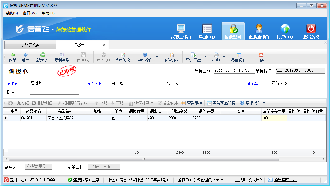 信管飛RMS及信管飛倉庫管理軟件都支持調撥單,調撥單主要用于庫存商品在各倉庫之間的調貨。調撥分為同價調撥和變價調撥兩種,其中同價調撥方式,商品的成本價以調出倉庫的成本價為準;變價調撥(或稱“異價調撥”),商品的成本價可進行修改,一般用于分攤運費/裝卸費等運輸費用。總部到門店的調撥一般采用變價調撥。 在功能導航窗點“倉庫管理”