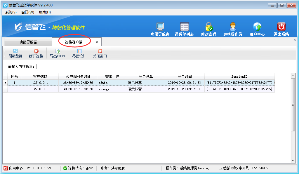亞拓軟件自主研發(fā)的信管飛RMS(進銷存軟件)、信管飛倉庫管理軟件、信管飛送貨單軟件、信管飛出納記賬軟件等軟件都支持多用戶同時登錄使用軟件,數(shù)據(jù)同步共享。 本文我們以信管飛送貨單軟件為例,介紹一下如何查看已登錄軟件的連接客戶端。 第一種方法:在信管飛送貨單軟件應用中心程序中查看已登錄軟件的連