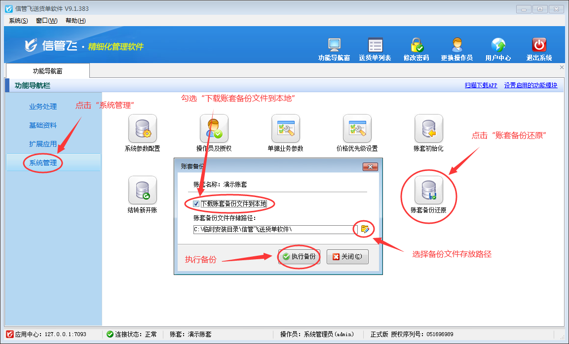 信管飛倉庫管理軟件、信管飛出納記賬軟件、信管飛送貨單軟件、信管飛RMS等軟件賬套數(shù)據(jù)默認存儲在軟件安裝目錄下,支持對賬套數(shù)據(jù)進行備份,如需要更換主機電腦,需要在原來的主機電腦上備份賬套數(shù)據(jù),將生成的備份文件復制到新的主機電腦上,然后在新的主機電腦上安裝軟件,使用備份文件還原數(shù)據(jù)即可。 以信管飛送貨單軟件為例,演示一下更換電腦