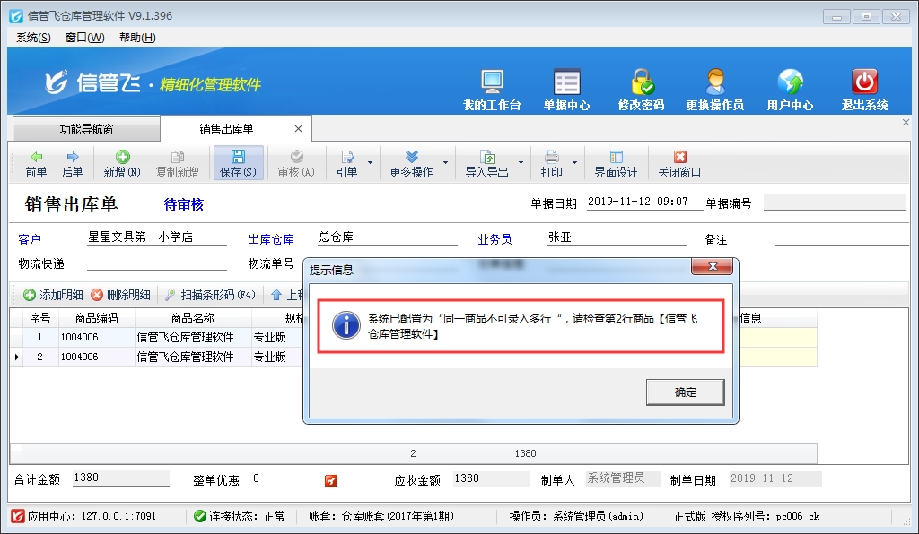 信管飛送貨單軟件、信管飛倉庫管理軟件、信管飛RMS等軟件在新開業(yè)務單據(jù)時默認在單據(jù)明細內支持同一商品可添加多條記錄(如下圖所示),部分用戶在開單時需要設置在單據(jù)明細中同一商品不可錄入多行?該如何設置呢?本篇文章我們以信管飛倉庫管理軟件為例來介紹一下如何設置開單時單據(jù)明細中同一商品不可錄入多行。 在功能導航窗點擊“系統(tǒng)管理”—