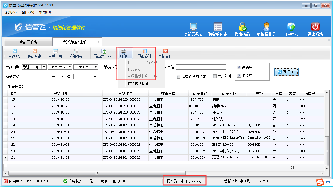信管飛送貨單軟件為集訂單管理、送貨管理、收款結算等功能并支持送貨明細對賬及業務綜合對賬的送貨單打印軟件。軟件根據錄入的每張訂單及送貨單等數據,可以自動生成統計報表,完成企業銷售統計查詢和與客戶對賬的目的,如下圖所示。如果不希望員工賬號登錄后打印送貨明細對賬單,如何設置呢?本篇文章介紹一下具體操作步驟。 登錄軟件,在功能導航窗
