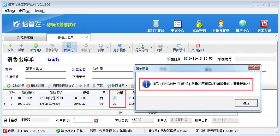 銷售出庫單開單時軟件支持引用銷售訂單進行發貨出庫,保存并審核銷售出庫單后,軟件會自動更新相應銷售訂單的執行狀態及訂單單據明細中每個商品的完成數量。其中銷售出庫數量是否可以超過訂單數量,可以在軟件中進行設置。下面我們以信管飛倉庫管理軟件為例介紹一下在軟件中如何設置“銷售數量不可超過訂單數量”? 在功能導航窗點擊“系統管理”—》