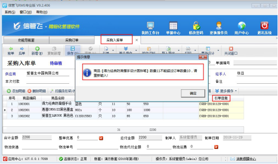 信管飛RMS、信管飛倉庫管理軟件、信管飛送貨單軟件等在業務單據保存時如果商品單價為0,系統會彈出提示信息,是否需要繼續保存,如下圖1所示,這樣以免用戶在添加商品明細時忘了填寫單價,好及時錄入,但是有一部分用戶在開單據時只需要填寫商品數量,不需要填寫單價,該怎么設置系統才能不彈出以下提示信息呢?本篇文章以信管飛倉庫管理軟件為例介紹一下如何設置出庫單保存時商品單價