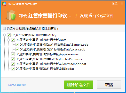 亞拓軟件所有軟件產品在升級的時候,都不需要先卸載原來的程序,可以直接安裝新版本即可,不會覆蓋原有的數據。部分用戶可能有先卸載然后再安裝的習慣,這個時候需要注意,安裝了360安全衛士的用戶,可能在卸載軟件后會提示是否刪除殘留文件,如下圖所示: 請務必不要刪除,因為軟件卸載程序沒有刪除的文件為賬套數據庫文件和程序配置文件,這些數