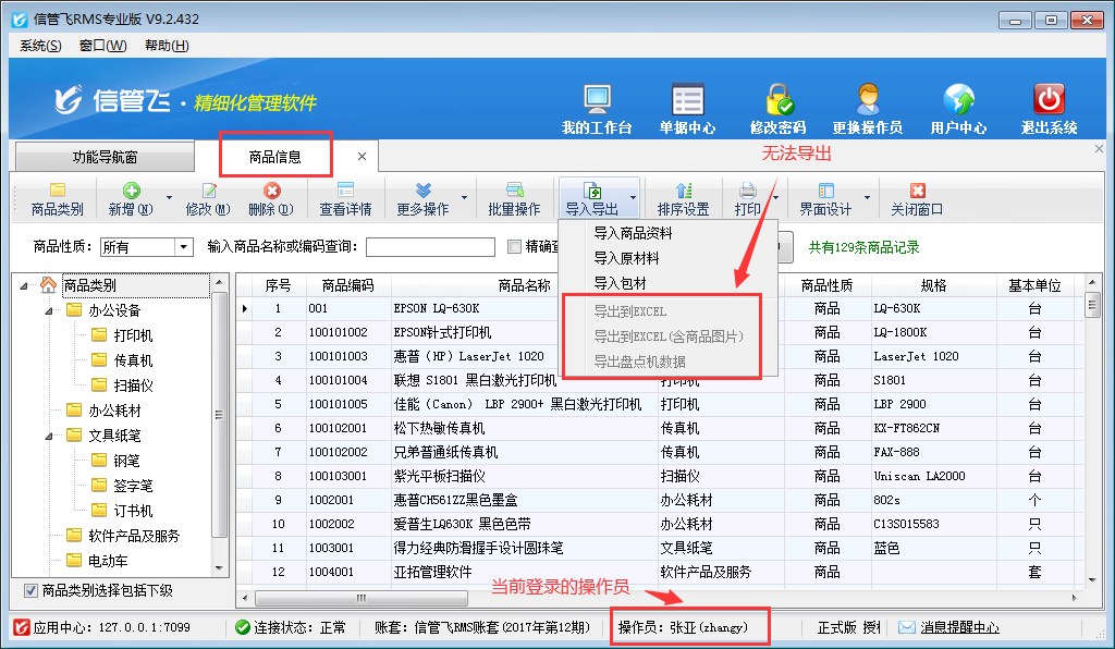 信管飛送貨單軟件、信管飛RMS、信管飛倉庫管理軟件等都支持管理基礎(chǔ)資料信息和允許設(shè)置多個(gè)操作員進(jìn)行登錄軟件。軟件支持將基礎(chǔ)資料信息以EXCEL的形式導(dǎo)出放到自定義的文件夾內(nèi)以便用戶備份或保存數(shù)據(jù),如果需要設(shè)置操作員不允許導(dǎo)出商品信息,如何設(shè)置?本文以信管飛RMS專業(yè)版為例,示范下如何設(shè)置操作員不可導(dǎo)出商品信息。 在功能導(dǎo)航窗
