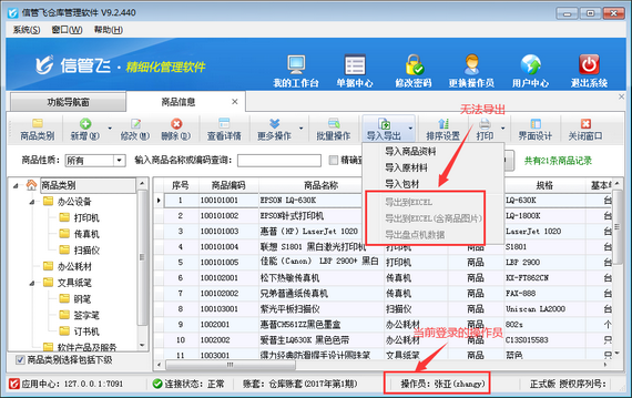 信管飛送貨單軟件、信管飛RMS、信管飛倉庫管理軟件等都支持管理基礎(chǔ)資料信息和允許設(shè)置多個操作員進行登錄軟件。軟件支持將基礎(chǔ)資料信息以EXCEL的形式導(dǎo)出放到自定義的文件夾內(nèi)以便用戶備份或保存數(shù)據(jù),如果需要設(shè)置操作員不允許導(dǎo)出商品信息,如何設(shè)置?本文以倉庫管理軟件為例,示范下如何設(shè)置操作員不可導(dǎo)出商品信息。 在功能導(dǎo)航窗點擊“