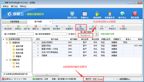 信管飛送貨單軟件、信管飛RMS(進銷存管理軟件)、信管飛倉庫管理軟件等都支持管理基礎(chǔ)資料信息和允許設(shè)置多個操作員進行登錄軟件。軟件支持將基礎(chǔ)資料信息以EXCEL的形式導(dǎo)出放到自定義的文件夾內(nèi)以便備份或保存,如果需要設(shè)置操作員不允許導(dǎo)出客戶信息,如何設(shè)置?本文以進銷存管理軟件為例,示范下如何設(shè)置操作員不可導(dǎo)出客戶信息。 在功能