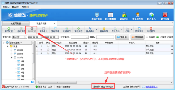 信管飛出納記賬軟件中支持刪除憑證,憑證保存后如發(fā)現(xiàn)填寫錯誤,可以刪除憑證重新新增,如下圖所示。 如果需要操作員不可刪除日記賬憑證,軟件也支持設(shè)置操作員不可刪除日記賬憑證權(quán)限,下面以信管飛出納記賬軟件專業(yè)版為例來演示一下設(shè)置操作員不可刪除日記賬憑證權(quán)限操作步驟。 登錄軟件,在功能導(dǎo)航窗點擊“