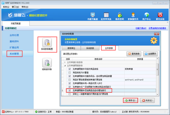 部分用戶在剛開始試用軟件時,開單添加一個商品后,不清楚如何在單據明細內繼續增加新的商品信息,如下圖所示,此問題在鍵盤上面按方向下鍵即可在單據明細中增加一行新行,另外軟件也支持設置在單據明細中添加商品后自動增加新行,本文以送貨單軟件為例演示一下具體設置方法。 在功能導航窗點擊“系統管理”—》“系統參數設置”—》“業