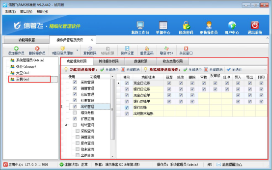信管飛RMS軟件、信管飛倉庫管理軟件、信管飛出納記賬軟件、信管飛送貨單軟件等都支持設置多個操作員登錄軟件,本文以信管飛RMS軟件標準版為例演示一下如何新增操作員賬號并設置操作員權限? 操作員及授權實現對操作員的管理和權限分配。權限分為功能模塊權限、其他操作權限、數據權限等。另外部分權限(如資金賬戶權限