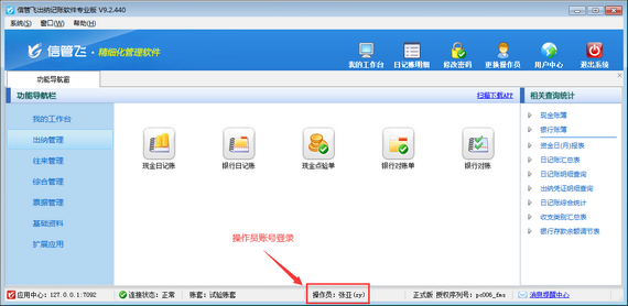 信管飛出納記賬軟件包括期末結賬的功能,當本期(即本月)的業務已審核處理完畢,就可以進行期末結賬處理。結賬后自動進入下一個賬期(月份),12月份結賬后將進入下一個年度。結賬后如果發現單據錯誤或賬簿數據有誤,可以進行反結賬處理。 另外,軟件支持操作員賬號及權限管理功能,支持設置多個操作員賬號可登錄軟件,本篇文章介紹一下如何設置操