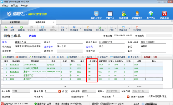 信管飛送貨單軟件、信管飛倉庫管理軟件、信管飛RMS(進銷存軟件)開單時,當商品存在打折情況時,支持錄入商品的折扣率。當商品明細的內容比較多時,為了快速開單,提高效率,可以批量更新單據明細中的折扣率。下面我們以信管飛RMS專業版為例詳細介紹下如何批量修改商品折扣率。 登錄軟件,在功能導航窗點“銷售管理”—》“銷售出庫單”,進入