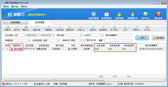 收款結算單用來登記收款信息(收款對象即客戶、收款賬戶、收款金額、經手人等),并結銷應收款記錄。正常情況下,應收金額為多少,客戶需支付我們多少貨款,但是部分情況下,客戶支付給我們貨款時可能因為各種原因只能給我們支付其中一部分,然后過段時間在支付剩余貨款。本篇文章以送貨單打印軟件為例演示一下部分收款的情況下如何開收款結算單。 如