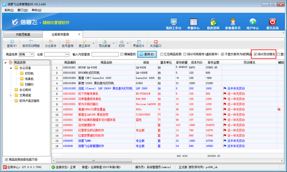 信管飛RMS、信管飛倉庫管理軟件可以對商品庫存進行統計,也支持統計商品近期的出庫情況,可以統計近半年、近一年無出庫的商品,方便對商品出庫情況進行管理。本篇文章以倉庫管理軟件為例介紹下倉庫管理軟件中如何統計近期無出庫的商品。 在功能導航窗中點擊“倉庫管理”—》“倉庫庫存查詢”,即可進入倉庫庫存查詢界面,勾選“統計變動情況”,再