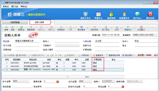 信管飛RMS軟件、信管飛倉庫管理軟件、信管飛送貨單軟件等支持在采購單、銷售單匯總表(送貨單匯總對賬單)、采購單、銷售單明細(xì)查詢(送貨明細(xì)對賬單)、采購訂單、銷售訂單明細(xì)表(訂單明細(xì)查詢)中設(shè)置擴(kuò)展信息為查詢條件,可匯總單據(jù)明細(xì)或者單據(jù)主體項中擴(kuò)展信息內(nèi)容。 以“采購單明細(xì)查詢”為例,示范下如何在界面設(shè)