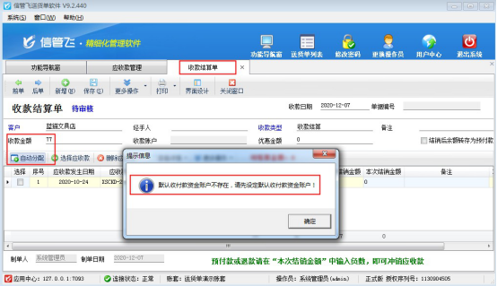 信管飛送貨單軟件是一款集開單送貨和應收款管理的軟件,軟件開單后可對開單生成對應的應收款進行收款結算,有客戶開收款結算單時候,輸入收款金額點擊保存會提示“默認收付款資金賬戶不存在,請先設定默認收付款資金賬戶!”,無法保存單據,如下圖所示: 這種情況是因為在系統內沒有設置默認資金賬