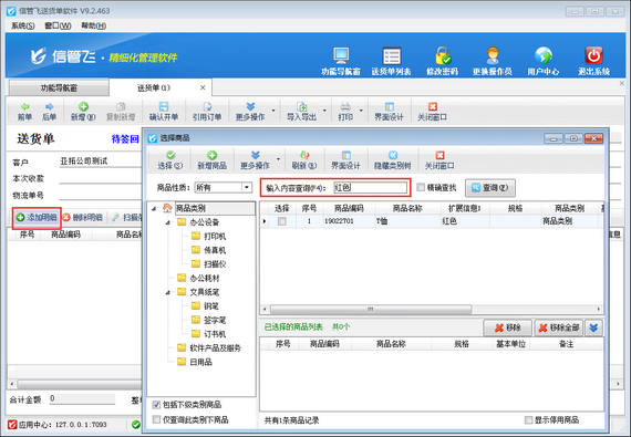 信管飛RMS、信管飛倉庫管理軟件、信管飛送貨單軟件開單時都支持選擇系統內已錄入的商品信息,進行快速選擇商品來開單。開單時,選擇商品窗口,可以根據商品編碼、商品名稱、規格、條形碼等信息查詢商品,如果“商品擴展信息”錄入了數據,我們也可以根據“商品擴展信息”進行查詢。下面我們以信管飛送貨單軟件為例介紹一下新開送貨單開單選擇商品時,根據“商品擴展信息”查詢商品的操作