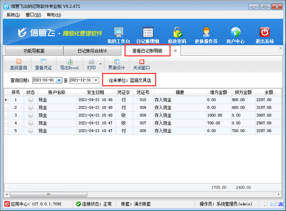 出納記賬軟件登記日記賬憑證時可以錄入往來單位信息,方便后續根據往來單位進行查詢統計數據,本篇文章介紹一下出納記賬軟件中如何按往來單位統計? 在功能導航窗點擊“出納管理”—》“現金日記賬”,新增日記賬憑證時選擇一下往來單位信息,如下圖所示。 然后在“出納管理”模塊最右側的“相關查詢統計”內點