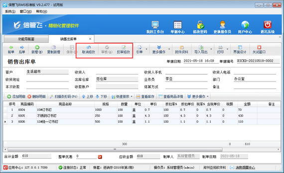 信管飛RMS是進銷存一體化的軟件,支持管理往來應收應付款,銷售出庫單審核后自動生成銷售應收款信息,可以對銷售應收款進行收款結算,如銷售應收款已結銷的情況下,發現銷售出庫單有填開錯誤,需要修改,系統默認是不能直接進行反審修改操作,如下圖所示。 如出現以上情況,可以先將銷售出庫單相關的結銷記錄紅沖(或刪除)后,然后在修改銷售出庫