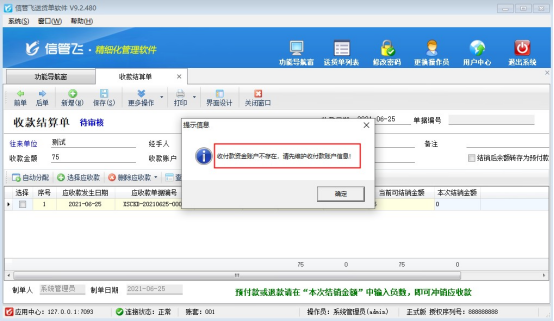 信管飛軟件包括信管飛RMS軟件、信管飛出納記賬軟件、信管飛送貨單軟件(送貨單軟件只有應收款),支持對應收應付款進行收付款結算操作,方便用戶查看收付款情況。對于客戶在結算時保存不了結算單,本篇文章以收款結算單進行示范下如何解決。 一、保存時提示“收款金額+優惠金額大于本次結銷金額合計”,無法保存。如下圖