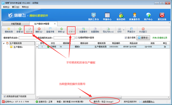 生產模板,即BOM清單(物料清單),可配置每生產一個標準單位的產品需要的原材料種類和數量。為了避免操作員誤修改生產模板數據,軟件支持設置操作員賬號不允許修改生產模板,本篇文章介紹一下進銷存管理軟件中如何設置操作員不可修改生產模板? 登錄軟件,在功能導航窗點擊“系統管理”—》“操作員及授權”,進入“操作員管理及授權”界面,選擇