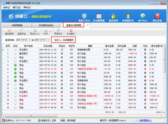 出納記賬軟件登記日記賬憑證時可以選擇經(jīng)手人信息,方便后續(xù)根據(jù)經(jīng)手人進行查詢統(tǒng)計數(shù)據(jù),本篇文章介紹一下出納記賬軟件中如何按經(jīng)手人統(tǒng)計? 在功能導航窗點擊“出納管理”—》“現(xiàn)金日記賬”,新增日記賬憑證時選擇一下經(jīng)手人信息,如下圖所示。 然后在“出納管理”模塊最右側(cè)的“相關查詢統(tǒng)計”內(nèi)點擊“日記